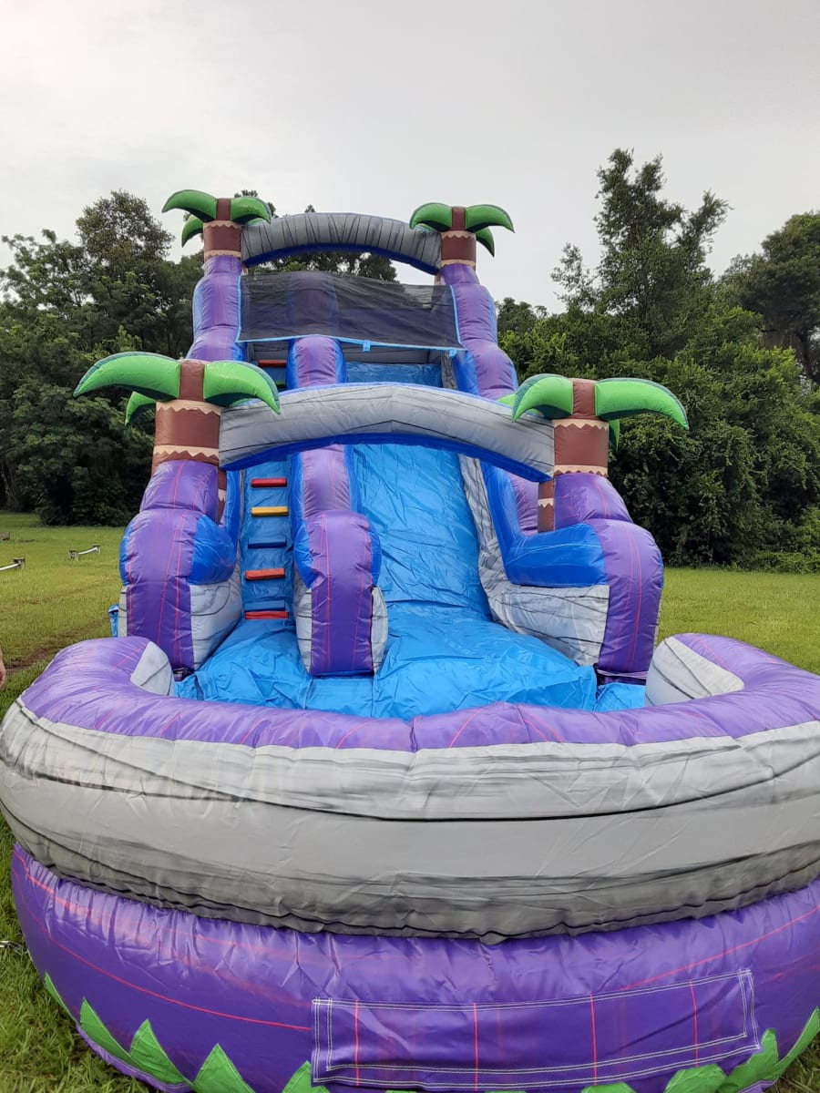 Single lane waterslide includes sprinkler hose to attach to your hose and sprinkle down the slide to cool off on those hot Florida days.
