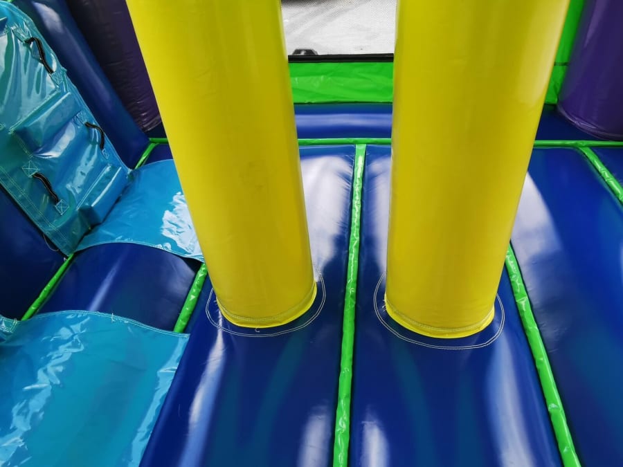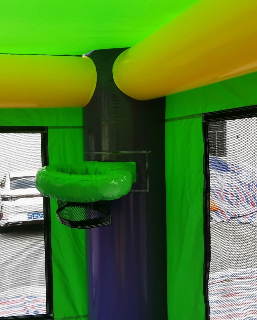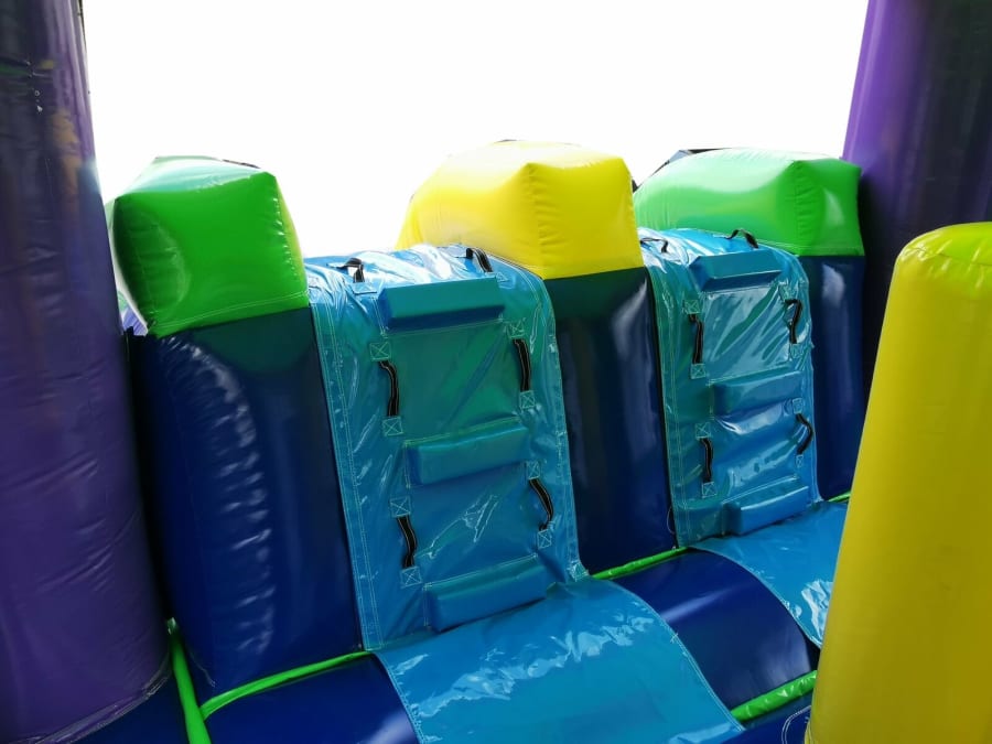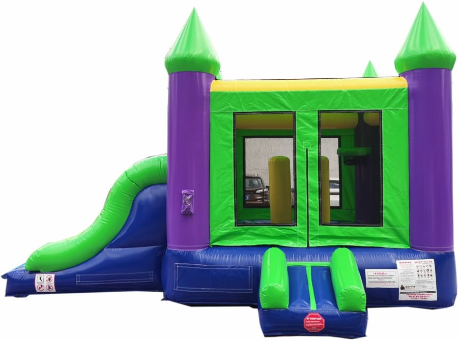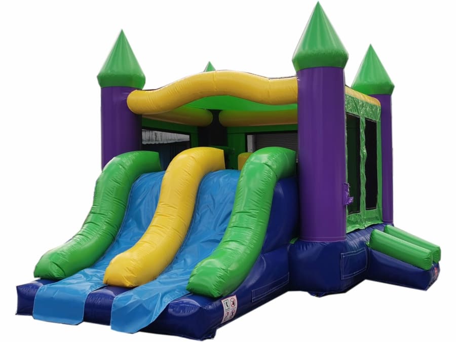 This unit has obstacles, ball hoop inside and two slides for racing down. The basic colors make it ideal for boys or girls party. This popular slide will be a hit at your next event or party. Extra wide lanes for all age children and ball hoop with obstacles inside. This unit dry only, no attached pool.