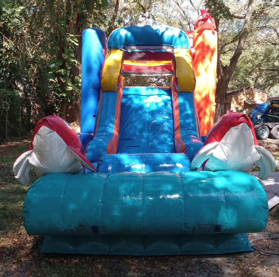Features large jump area and wide slide kids and splash into a pool at the bottom.