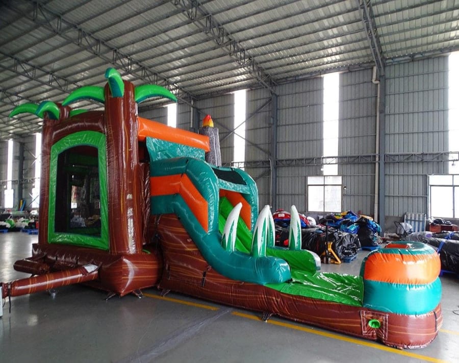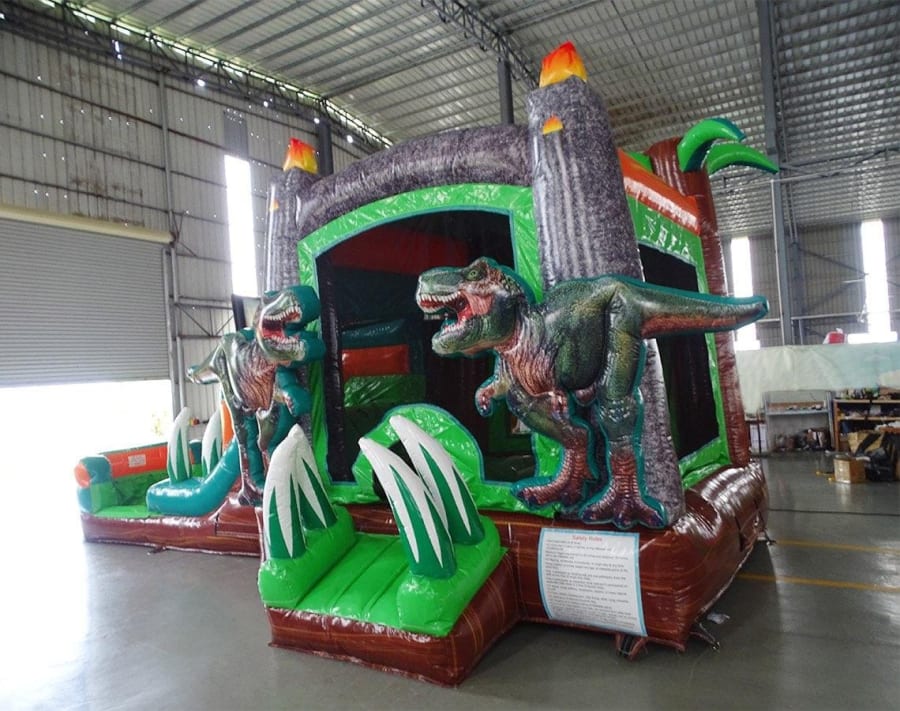 This dinosaur combo will be a huge hit at your next event. Tiki Flames on top, 2 Dinosaurs at entrance and Dino teeth as you walk in. There are two ball hoops in jumping area and as you slide down it appears you're sliding down the mouth of a dinosaur with the large teeth wrapped around the slide. Unit can be rented wet or dry. This will light up all your party goers faces with awe.