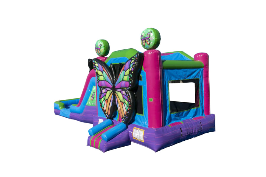 Beautiful Butterfly waterslide and bounce house combo looks 3D with its amazing design. Double slides let's party goers race down the slides as they unge into the pool at the bottom. This unit can be wet or dry. We rent to.all Hillsborough County and surrounding areas. Book today and be the talk of the town with our latest addition. Can be set up day before event depending on flexibility of renter. Don't forget to.add on a game or even cotton candy machine.