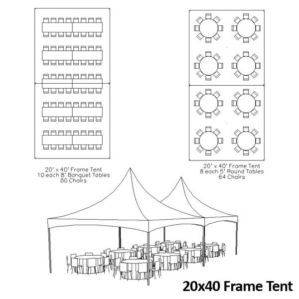 Reserve the 20x40 High Peak Tent to create a weatherproof, open, professional event space. Contact us for quotes, add-ons and multi-day pricing.